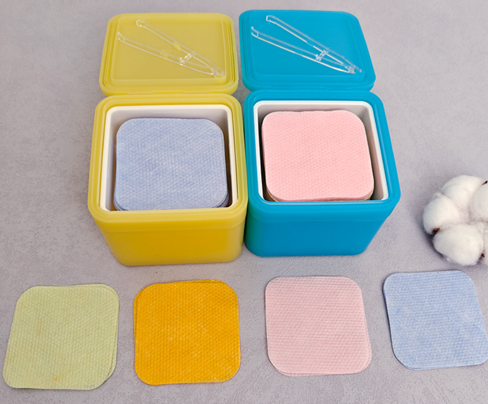 Wet compress cotton pad, can be used for wet compress, makeup removal, cleaning, gentle on skin, no fluorescent agent. 6.7cm x 6.7cm, 6.5cm round pad. Yellow, white,pink, blue.