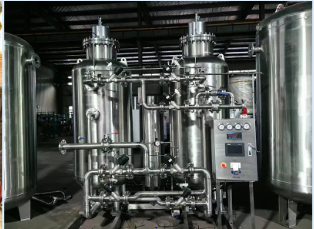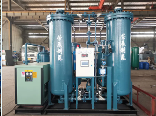 PSA nitrogen generation is a technology to separate nitrogen from air by the adsorption ability of carbon molecular sieve under pressure by air compressor. After the air is compressed and purified (removing the oil, water and dust, etc.) before transferring into the absorption tower filled with carbon molecular sieves (CMS), the oxygen molecule will be adsorbed by carbon molecular sieve, while nitrogen molecules are too large so that they will not be adsorbed. Those nitrogen molecules will pass through the tower into the nitrogen buffer tank, while oxygen molecules remain in the CMS. The adsorption process is performed at certain pressure, after that, the atmospheric pressure will be resumed again, and the adsorbed oxygen molecules will escape from CMS, passing the bottom of the tower through the exhaust silencing muffler into the air, and the CMS is available to be reused. Usually PSA nitrogen generator adopts double adsorption towers in parallel, they will be used alternatively for the adsorption and collection of the nitrogen under different pressure, continuously supporting the separation of oxygen and nitrogen and producing nitrogen. The above process will be automatically controlled by PLC system.